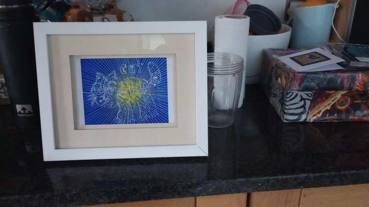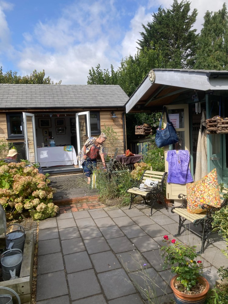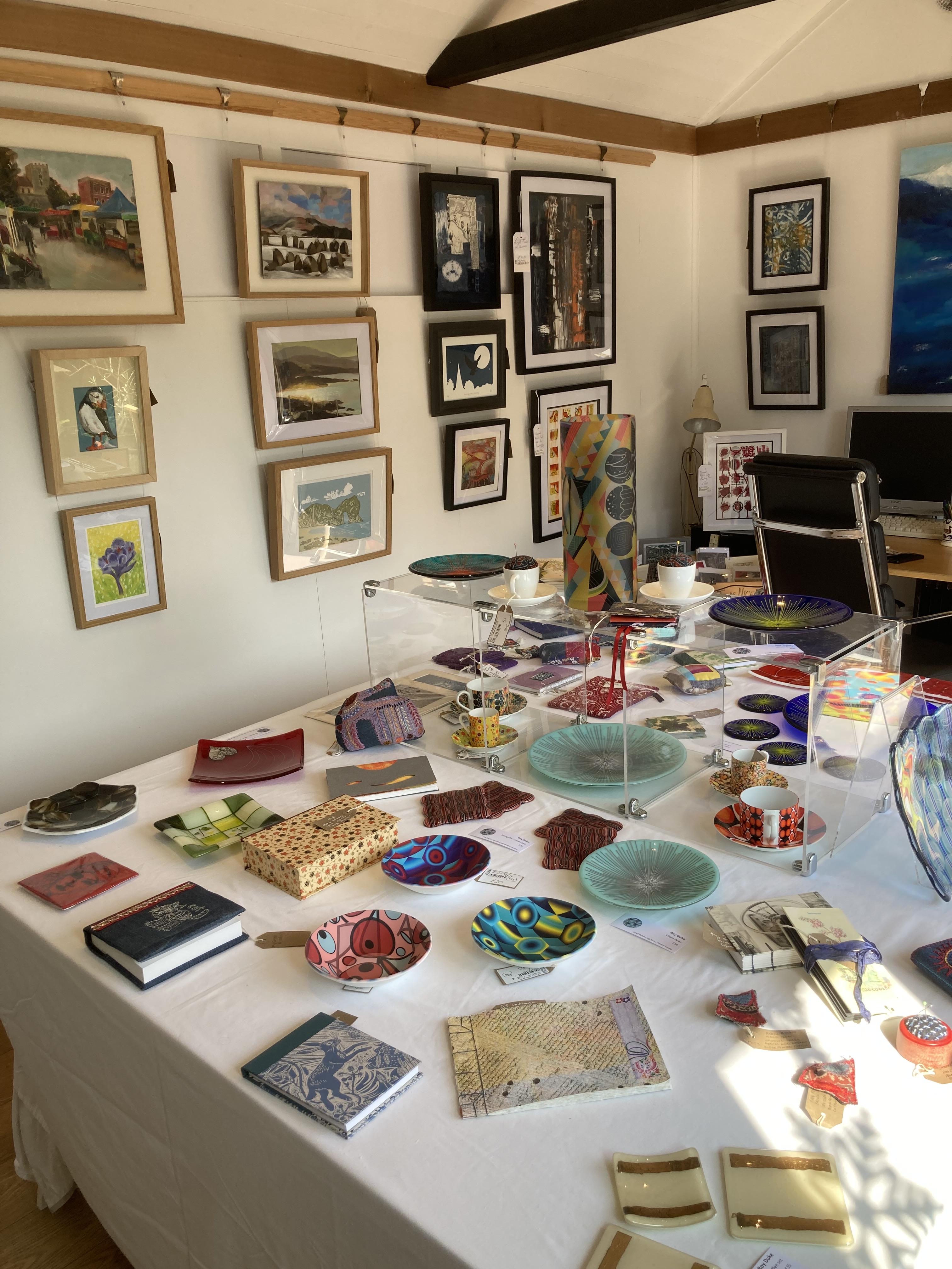 This was our third year of running an open studio and we had a great time meeting and greeting a lot of visitors. Whilst we were often busy, we found time to have a bit of fun (Theresa and Margaret sporting Helen’s bucket hats was typical!). There was also a bit of trickery with one of Roy’s fused glass plates and Helen’s stitched cat being blended to form a framed print.