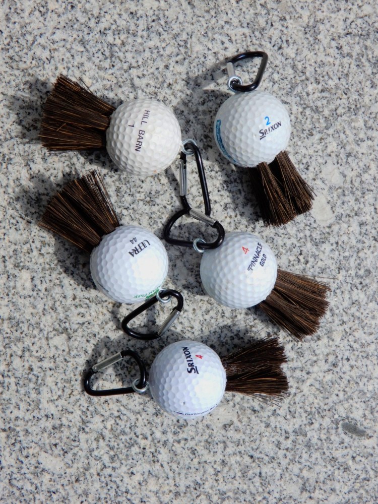 Below is a selection of Jenny’s creations. The latest addition to the portfolio is a brush fashioned from a golf ball. Ideal for getting into the grooves to clean the face of the clubs. Complete with a simple carabiner to clip it to your bag so it is always to hand.